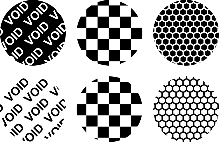 El holograma puede llevar otra protección (por un pago extra), la que destruye el holograma al despegar – esta capa se denomina Tamper Evident. Prácticamente se trata de una aplicación selectiva del pegamento sobre la pegatina de tal modo, que su destrucción será controlada al despegar la pegatina desde la superficie (será determinada con antelación). Usted puede elegir la destrucción clásica - de tipo VOID; al despegar la pegatina desde la superficie se queda pegada la palabra VOID de film metálico repitiéndose. Otras posibilidades a elegir son el patrón de tablero de ajedrez o "Honeycomb" (bresca de abeja). La parte opuesta al film de holograma (el negativo) se queda en la capa de protección superior transparente y no es posible pegarla otra vez en su estado original. Los hologramas sin la capa VOID forman la parte del grupo de los hologramas de protección estándar. Si no elige la capa VOID en su pedido, los hologramas no tendrán la protección controlada estándar, la que al despegar deja una cierta parte en la superficie (según el pegamento aplicado), del holograma se quita solo el film de protección superior sin el que se abrazará durante primer contacto. Estamos también capaces de producir las pegatinas sin protección ninguna para que se despeguen fácilmente desde los productos (sin dejar el residuo indeseado) antes de ponerlos en circulación– vasos, botes, ropa, etc.